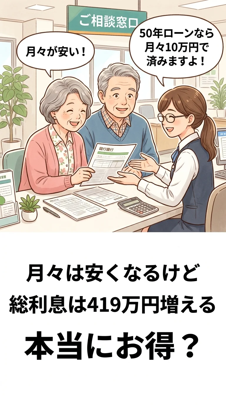 ➡️ 50年のほうが利息が約419.83万円多い(この例では金利も+0.10%上がっているため差が広がります)。
