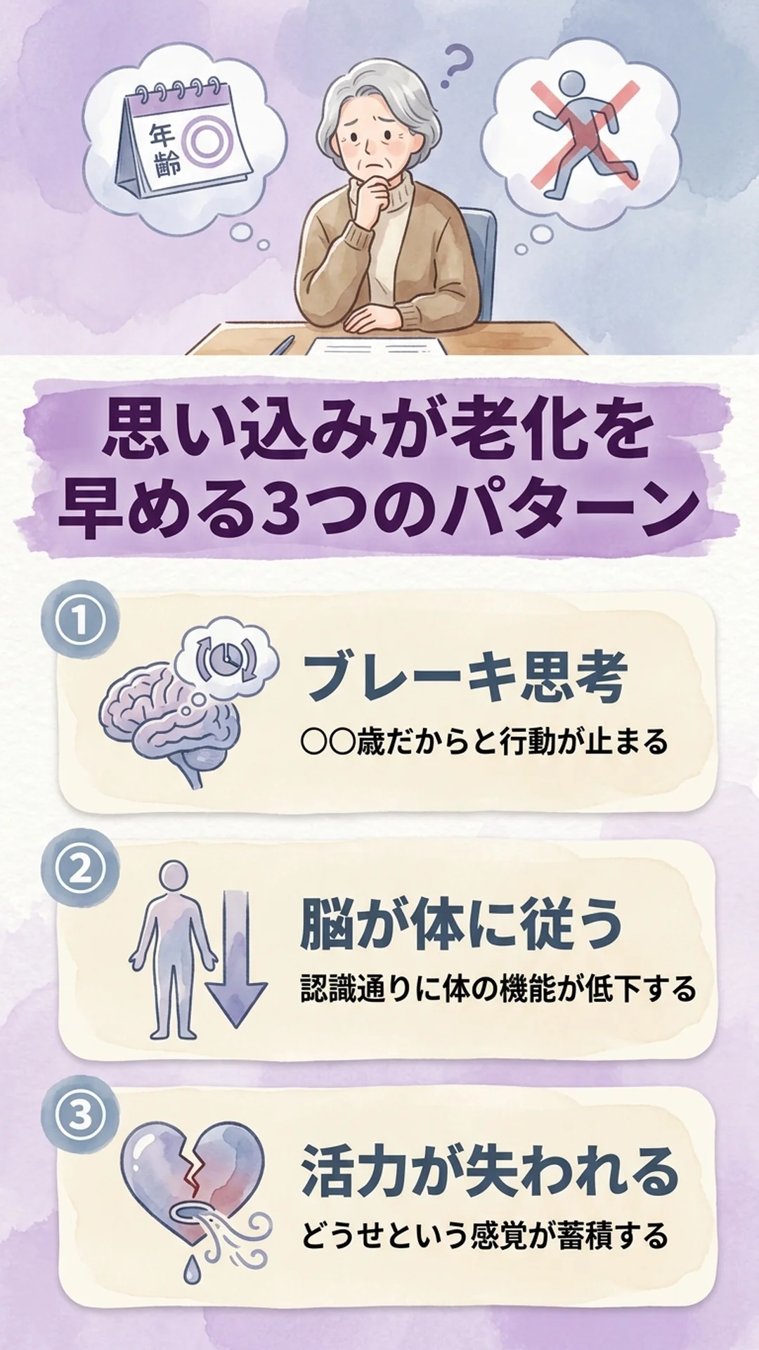 「〇〇歳だから」という思い込みがもたらす最大の害は、行動のブレーキだけではありません。「どうせ」「もう遅い」という感覚が心に積み重なることで、活力そのものが失われていくのです。年齢感覚と老化の悪循環は、まずここから始まります。