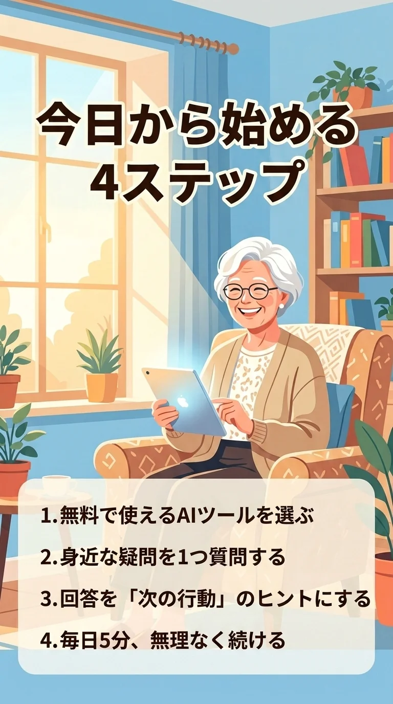 AIを活用する60代とそうでない60代では、情報の質・意思決定の精度・知的な充実感に、じわじわと差がついていきます。「自分には無理」という思い込みを一度脇に置いて、今日から小さく試してみてください。