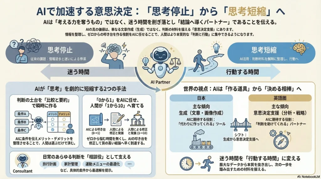 多くの人が「AIに頼ると頭を使わなくなる」と心配します。しかし、実際はその逆です。AIの本質的な価値は、私たちが答えを出すまでの**「迷っている時間」を削ぎ落としてくれること**にあります。