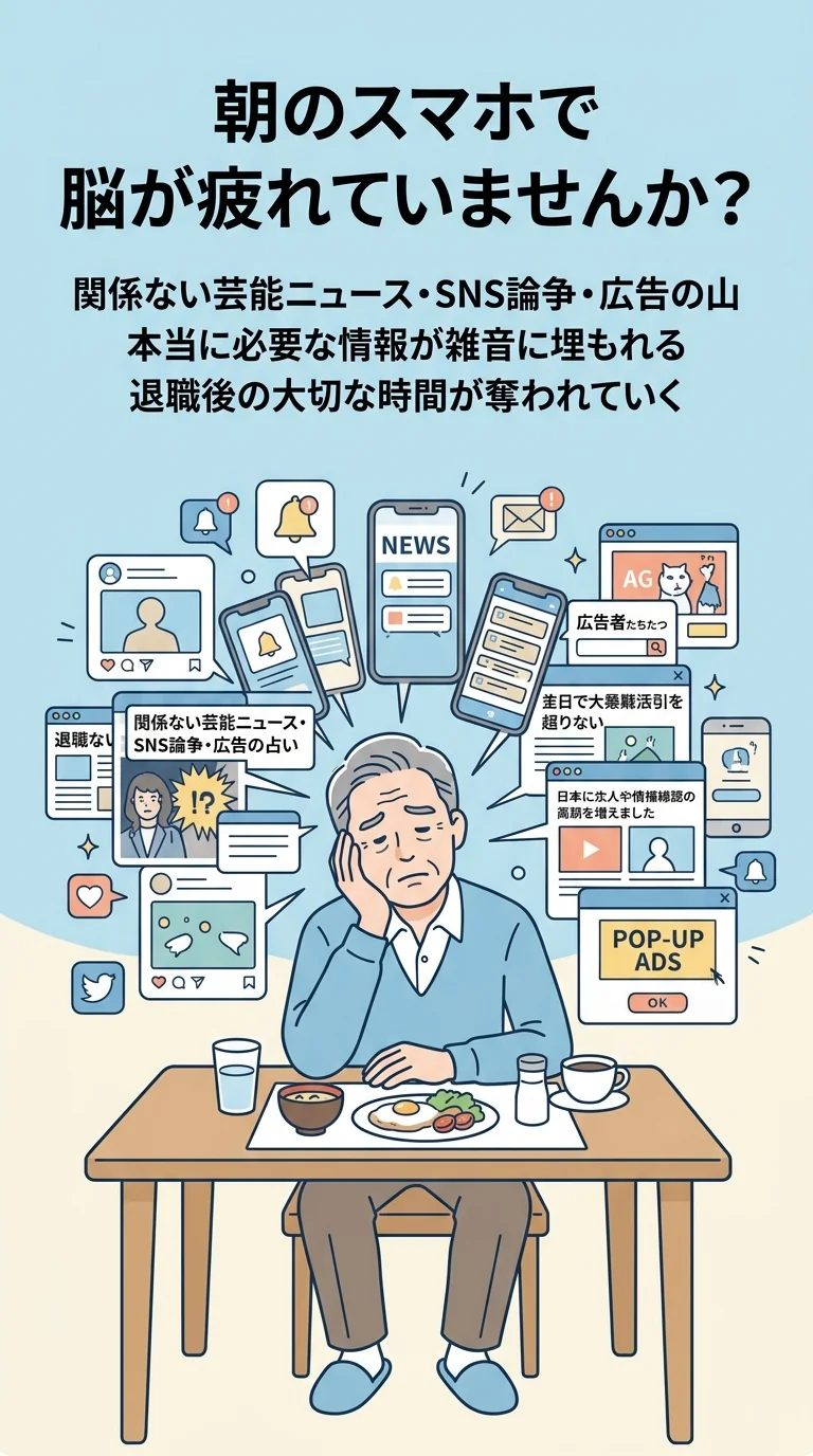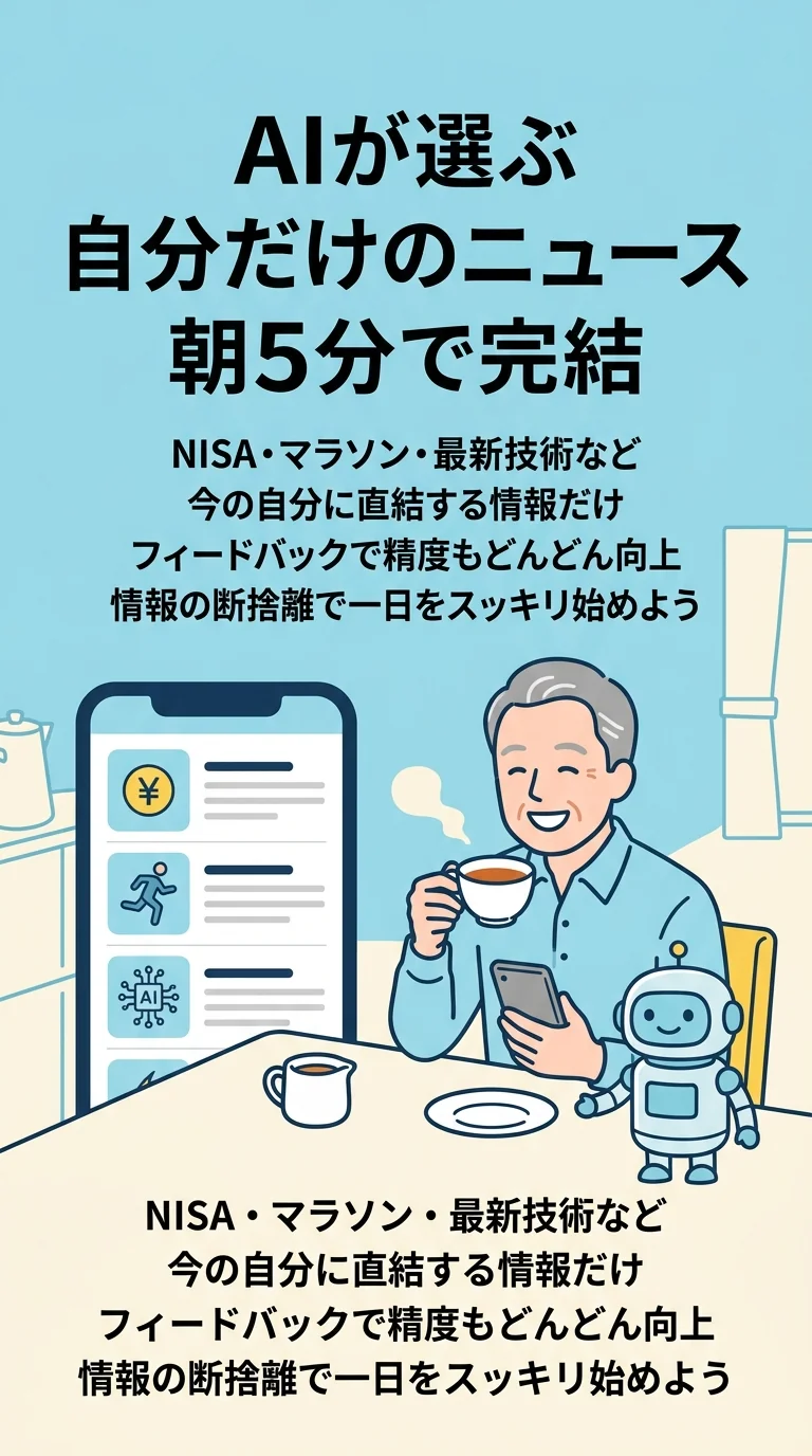 退職後、朝起きてまずスマホのニュースアプリを開く習慣がありました。しかし、興味のない芸能ニュースや煽り記事に時間を取られ、本当に知りたい情報に辿り着く前に疲れてしまう。そこでAIに「自分専用の情報フィルター」を任せてみることにしました。