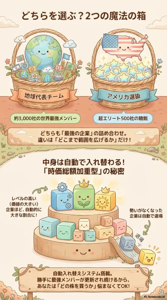 これらは単なる「株の詰め合わせ」ではありません。その正体は、**「世界で一番強いやつらが、自動で入れ替わる魔法の箱」**です。今回は、この2つの投資信託の正体を解説します。