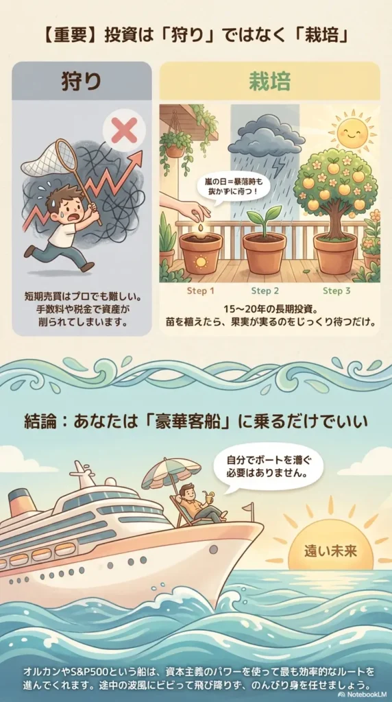 インデックス投資は、苗を植えて果実が実るのを待つ「栽培」に似ています。嵐の日(暴落)に苗を抜いてしまったら、一生収穫は訪れません。**「15年、20年と持ち続ける長期投資」**こそが、この仕組みを成功させるための必須条件なのです。