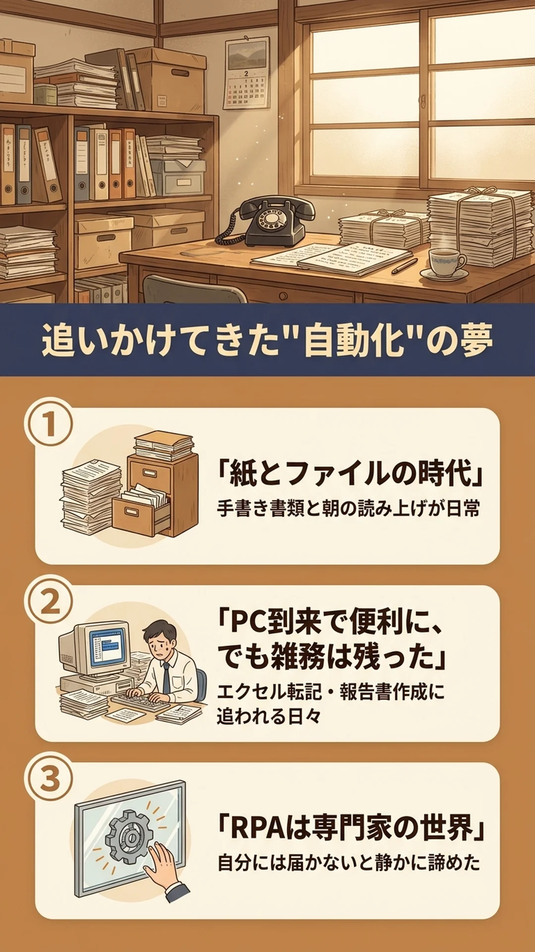この記事は「パソコンのなかった時代から追いかけてきた、自動化という夢」シリーズの第1回です。非エンジニアの私が、AIエージェントと向き合いながら体験したことを、ひとつずつ記録していきます。