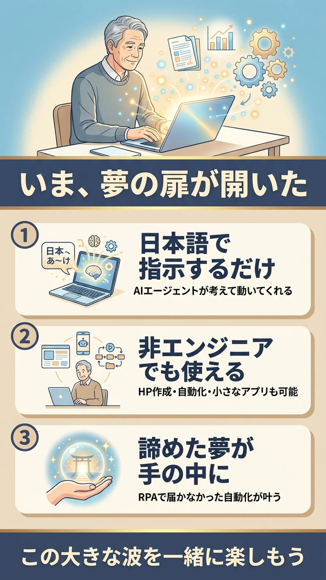 いま、私はAIエージェントという新しい道具と出会っています。日本語で指示するだけで、パソコンが自分で考えて動いてくれる——そういう時代が、ついに始まりました。プログラミングの知識がまったくない私のような人間でも、パソコンを自動で動かしたり、ホームページを作ったり、小さなアプリを作ったりできるようになっています。
