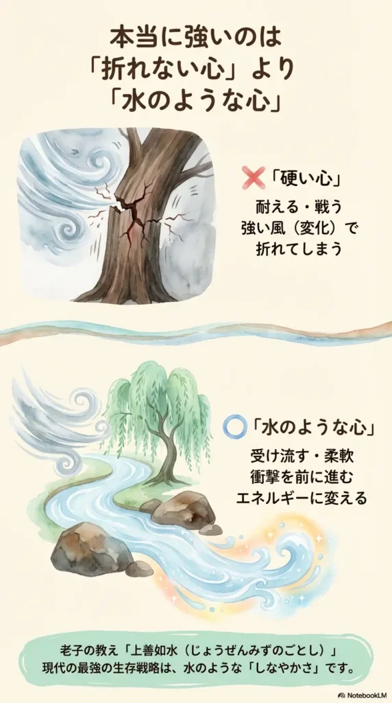 本当に強いのは、鋼のような硬さではなく、**水のような「しなやかさ」**なのです。
