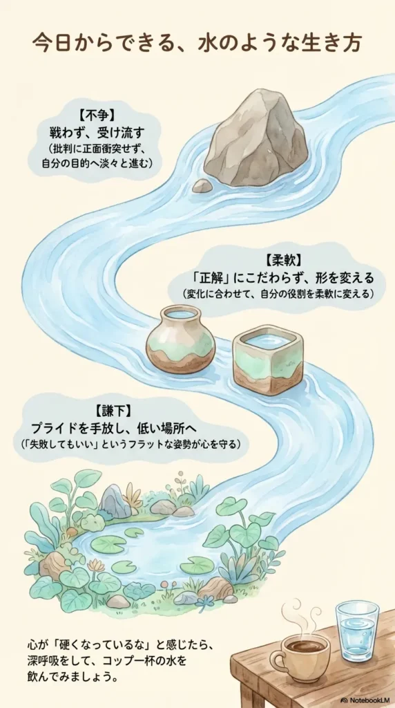 3. 「今、ここ」の重力に従う: 水は過去を振り返らず、未来を不安がりません。ただ、重力に従って目の前の隙間に流れ込みます。現代のキーワードであるマインドフルネスの極意も、実はここにあるのです。