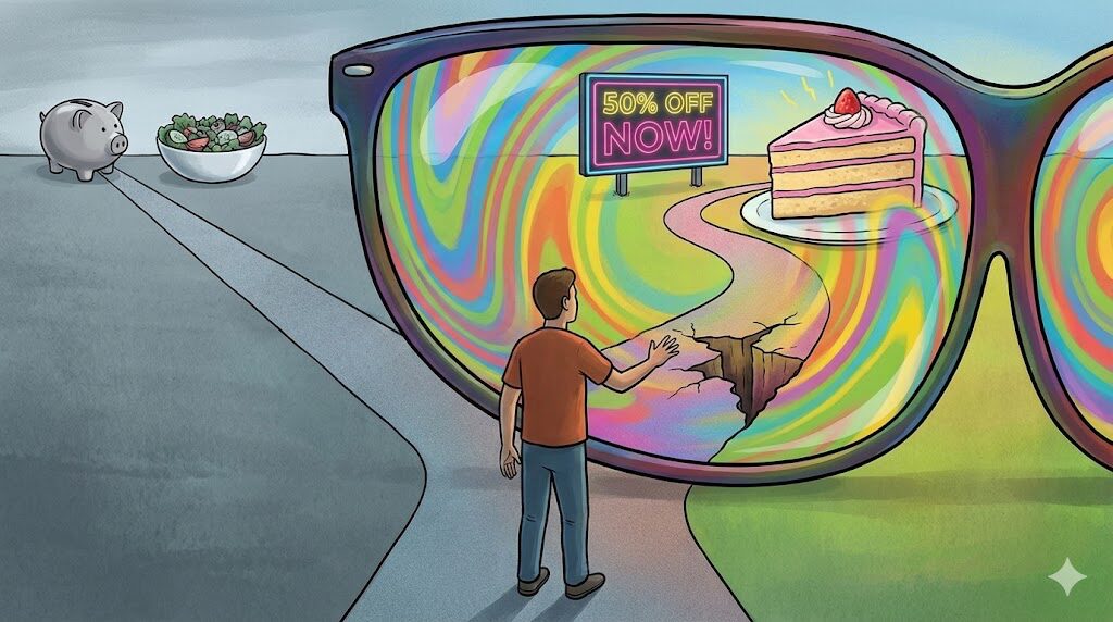 【解説】 脳にとって「将来」はイメージしにくく、「現在」は強烈なリアリティを持っています。 冷静な時には「将来の健康」を選べますが、誘惑が目の前にあると、脳の直感システムが暴走して「今の快楽」を選んでしまうのです。