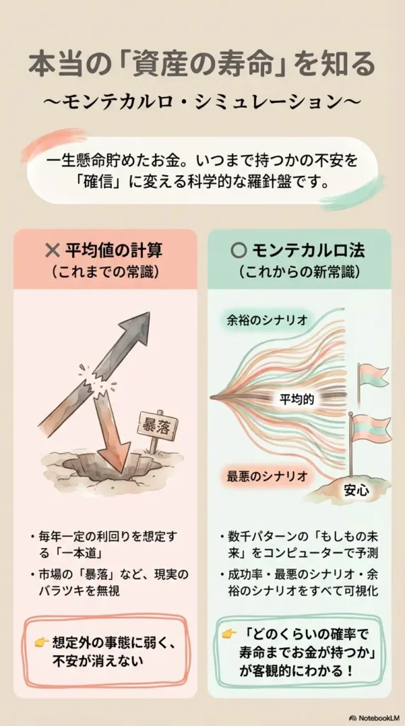 こうした漠然とした不安を、科学的な根拠に基づいた「確信」に変えてくれるツールがあります。それが**「モンテカルロ・シミュレーション」**です。