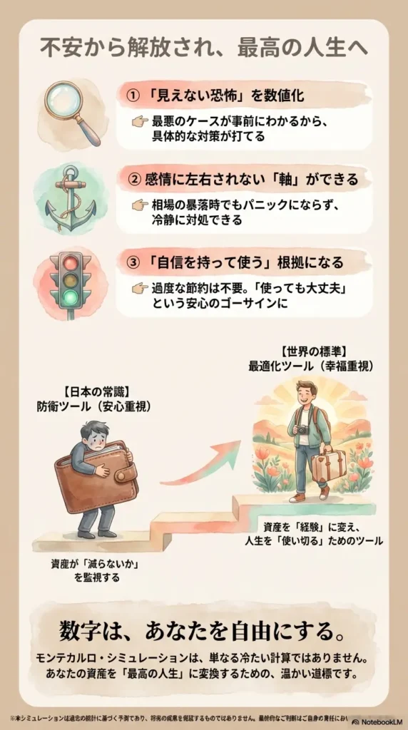 モンテカルロ・シミュレーションは、単なる冷たい計算ではありません。あなたが歩んできた努力の結晶である「資産」を、どのように「最高の人生」に変換していくかを教えてくれる、温かい道標です。