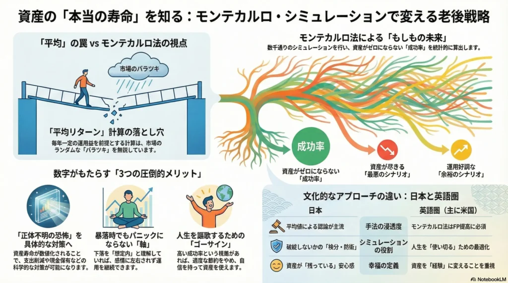 英語圏では「資産を余らせて死ぬこと」も一つの失敗と見なされることがあります。モンテカルロ法は、この「安心」と「人生の謳歌」を両立させるための、世界標準の知恵なのです。