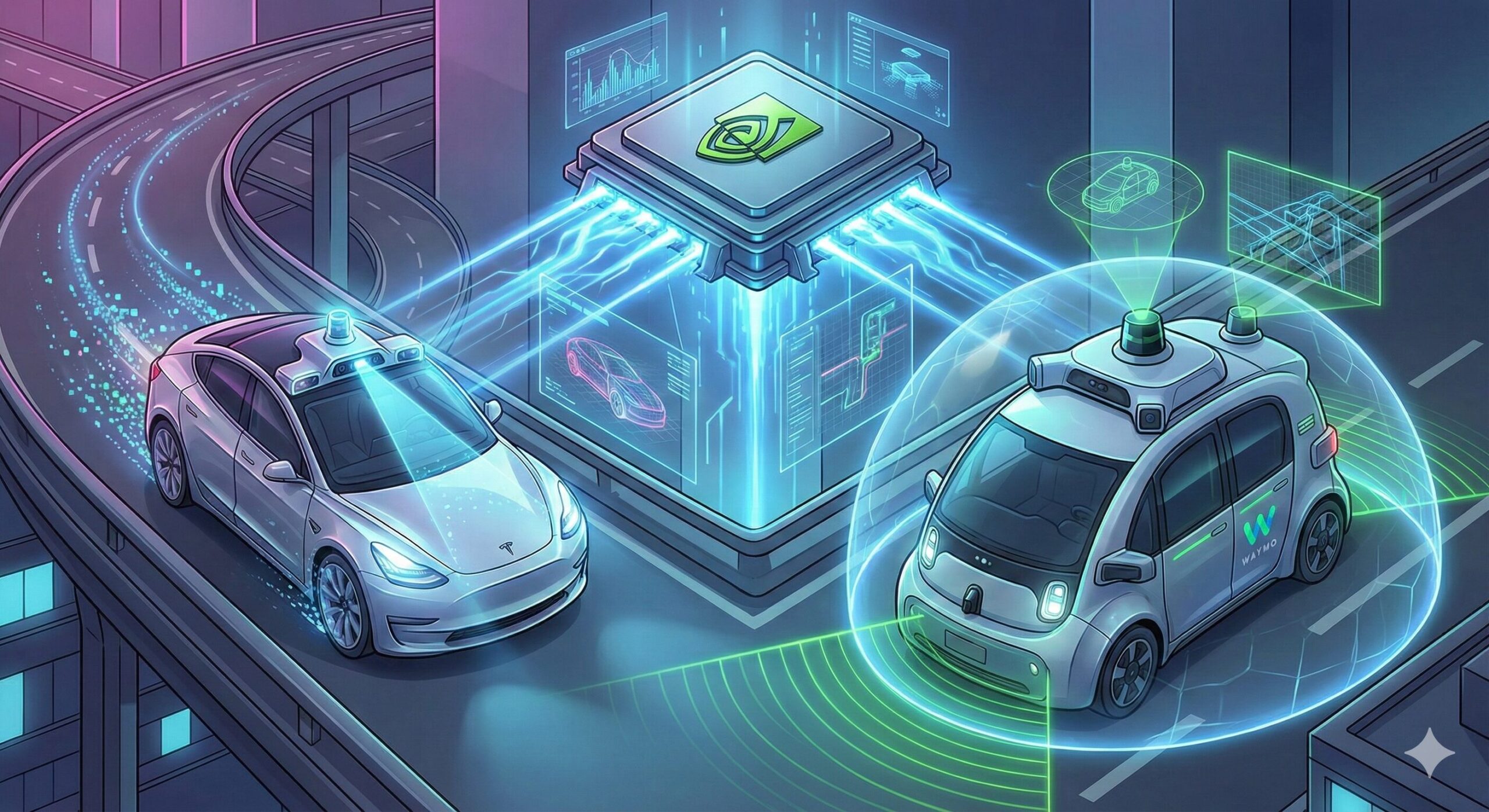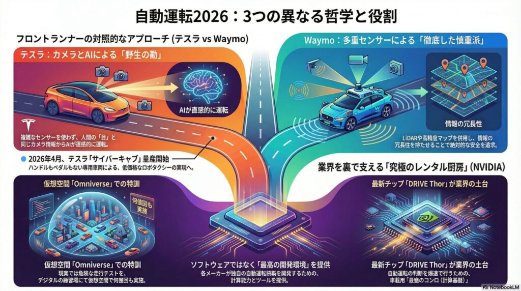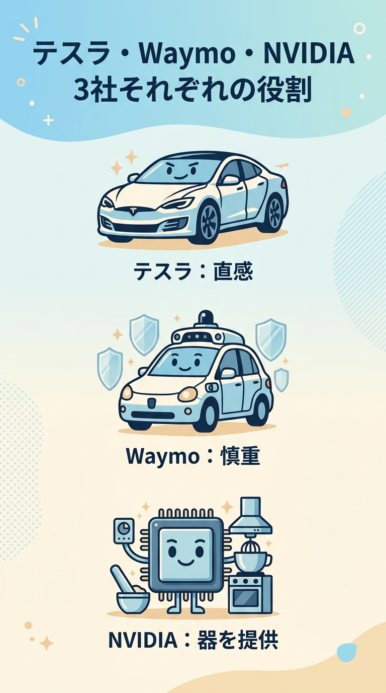 世界をリードするテスラとWaymo、そしてその裏で活躍するNVIDIA。この3者の役割を、身近なたとえ話で紐解いていきましょう。