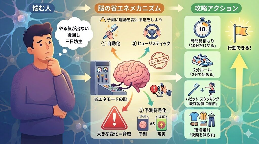 - 自動化(ルーチン化): 意識(前頭前野)を介さず、無意識(大脳基底核)で処理してエネルギーを節約する。