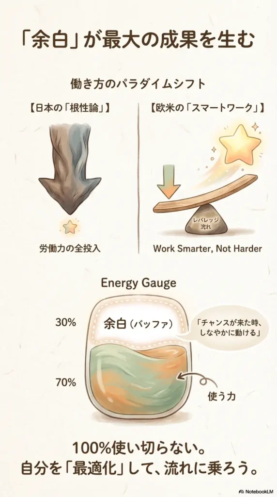 自分の体力を100%使い切るのではなく、30%くらいの余力を常に残しておく。その余白(バッファ)があるからこそ、チャンスが来た時にしなやかに動けるのです。