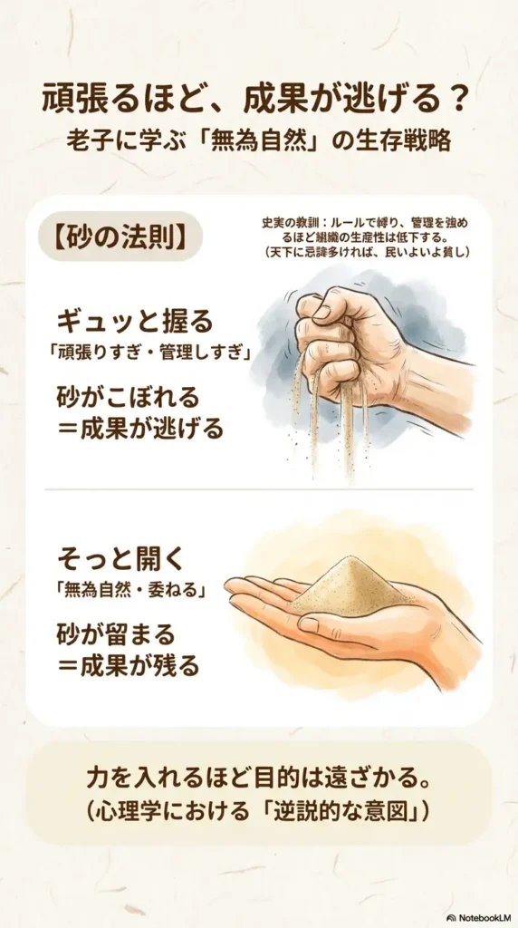 ビジネスの世界で言えば、がむしゃらな努力は「労働力という単一の資産」を全投入するギャンブルのようなものです。老子は、自分の力だけで解決しようとする「エゴ」を捨て、周囲の状況やタイミングという**レバレッジ(テコの原理)**を最大限に活かすことを推奨しています。