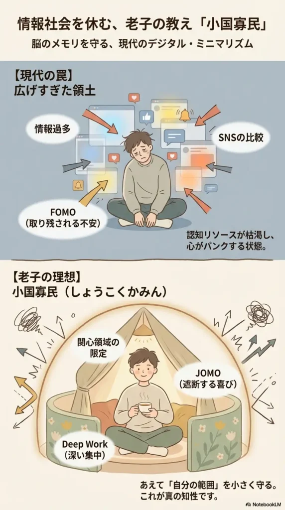 これは、私たちの「認知リソース」というアセット(資産)が、広げすぎた領土(情報収集範囲)によって枯渇している状態です。 「小国寡民」を現代流に解釈するなら、「自分の関心領域に明確な国境線を引くこと」、つまりデジタルミニマリズムの実践に他なりません。