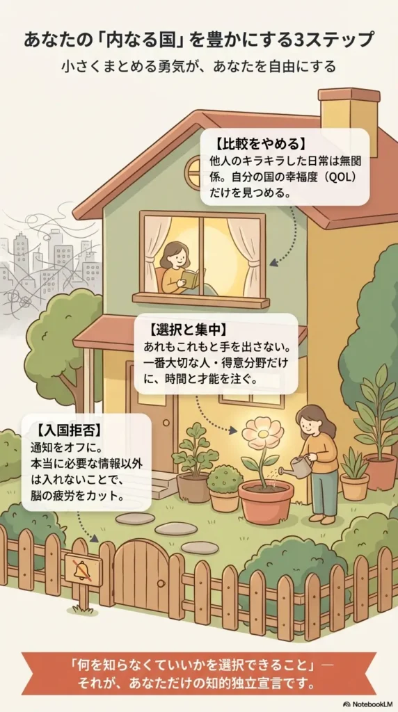 自分の領土(関心事)をあえて小さく限定し、その中で深く、しなやかに生きる。老子の「小国寡民」は、私たちが情報の波に飲み込まれず、自分自身の主権を取り戻すための**「知的独立宣言」**なのです。