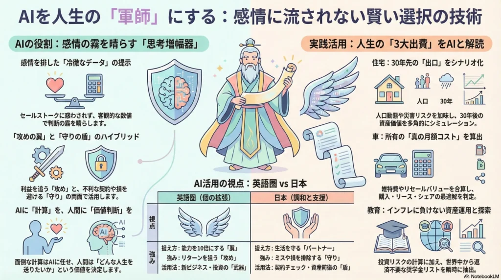 こうした魅力的な言葉(セールストーク)の霧に包まれると、数字の裏にある真実が見えなくなってしまいます。そこで必要になるのが、**「AIという名の軍師」**を味方につける新しい教養です。