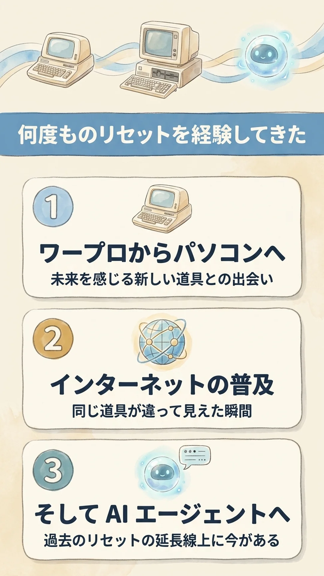 ワープロからパソコンへ、パソコンからインターネットへ、そしてAIエージェントへ。これは私にとって、何度目かの「リセット」の時期になります。