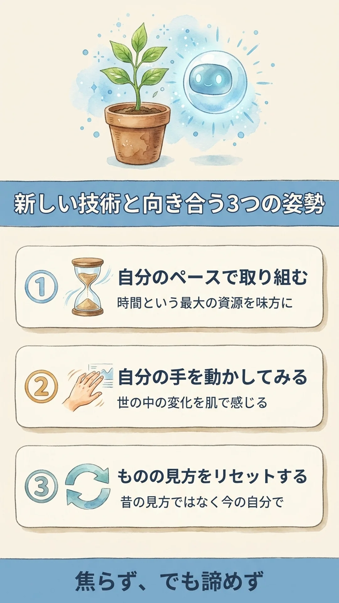 焦る必要はありません。でも、立ち止まる必要もありません。自分のペースで、自分の興味の赴くままに、新しい技術と向き合っていく。それが、私が今できる、新しい時代との一番自然な付き合い方です。