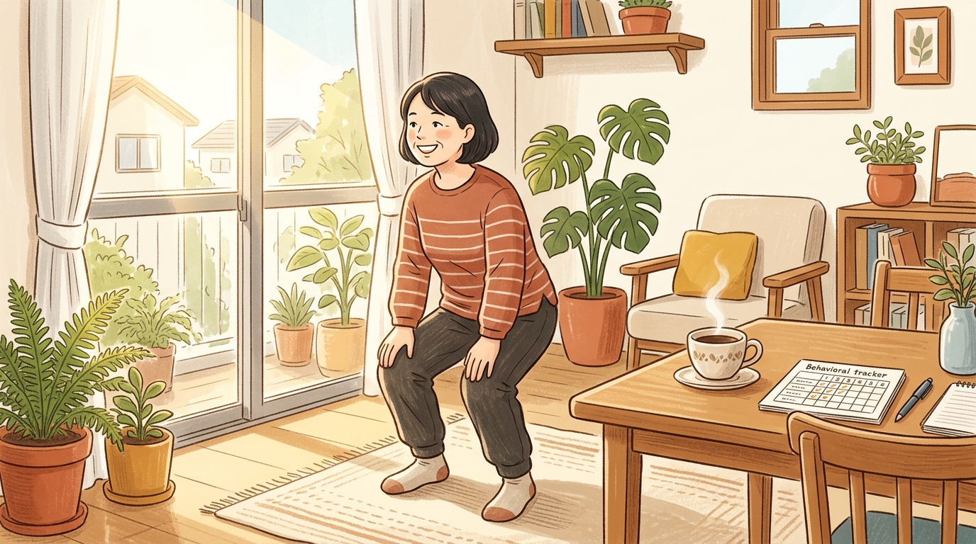 最初の目標は「恥ずかしいほど小さく」設定する。「1日1回、その場で足踏みを10秒」でもいい。脳は「続いている」という成功体験を積み重ねることで、行動を自動化していく。運動習慣を続けるコツの核心は、この「小さな勝利」の積み重ねにある。