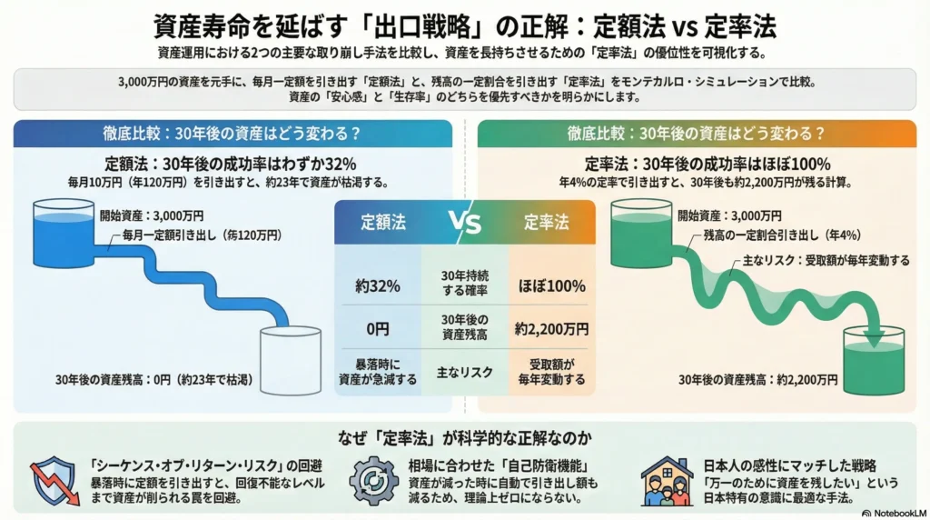 - 定額法: 家計管理は楽だが、市場の暴落に極めて弱い(資産寿命を削る)。