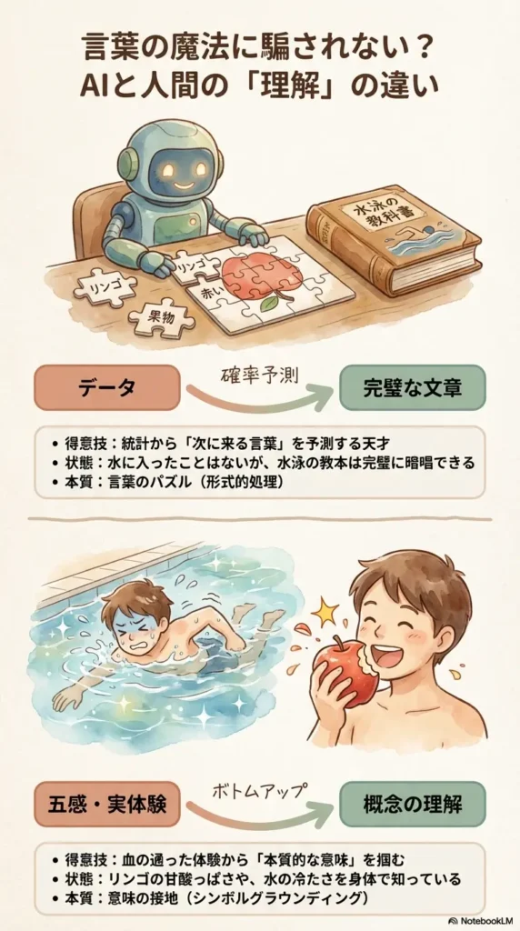 LLMは、いわば「一度も泳いだことがないのに、水泳の教本を完璧に暗唱できる人」のようなものです。言葉の使い方は完璧ですが、水に触れたときの冷たさは知らないのです。