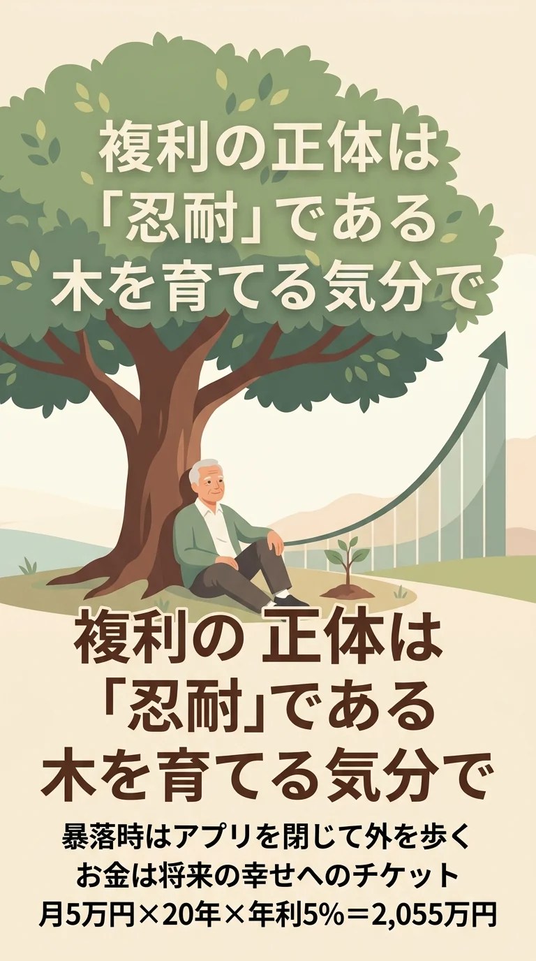 投資の進んでいる海外では、よく複利を**「木を植えること」に例えます。 苗木を植えたあと、毎日掘り起こして根っこをチェックする人はいませんよね?嵐が来ても、「ああ、今は木が鍛えられているな」と見守るだけです。 お金も同じです。あなたが寝ている間も、仕事をしている間も、複利というパートナーが勝手に働いてくれています。あなたはただ、「時々様子を見る親切な大家さん」**くらいの気持ちでいればいいのです。