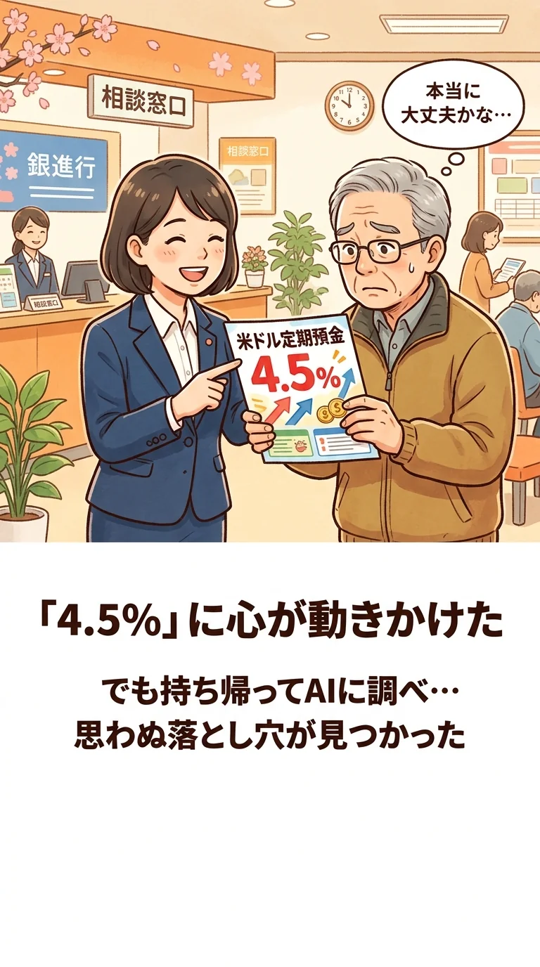 「パンフレットの『金利4.5%』は魅力的ですが、ここから**『為替手数料』**が引かれることを忘れてはいけません。円をドルに替える時、そしてドルを円に戻す時、銀行の為替レートには手数料が含まれています」