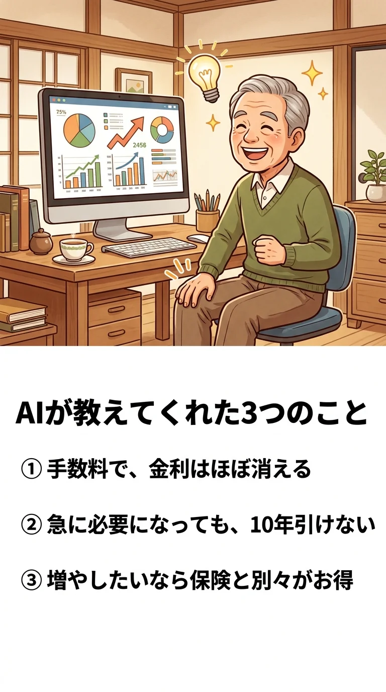 AIのおかげで、私は「高金利」という餌の奥にある、「資金拘束」という罠に気づくことができました。 老後の虎の子は、いつ入院や介護で必要になるかわかりません。 そんな大切なお金を、**「簡単には引き出せない場所」**に預けてはいけないのです。