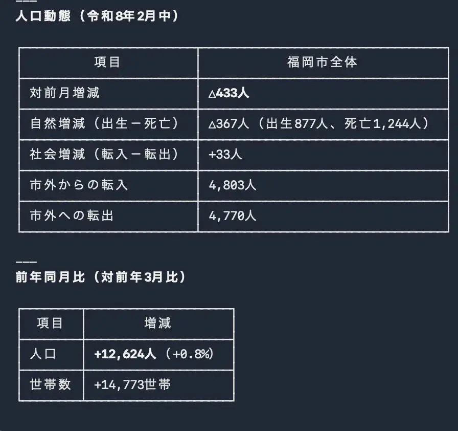 次に「福岡市の人口に関する統計データを取得してください」と入力しました。こちらも即座に、令和8年2月の人口動態が返ってきました。前月比で433人減、出生877人に対して死亡1,244人という自然減の一方、市外からの転入は4,803人。前年同月比では人口が12,624人(0.8%)増加し、世帯数も14,773世帯増えているという内容でした。
