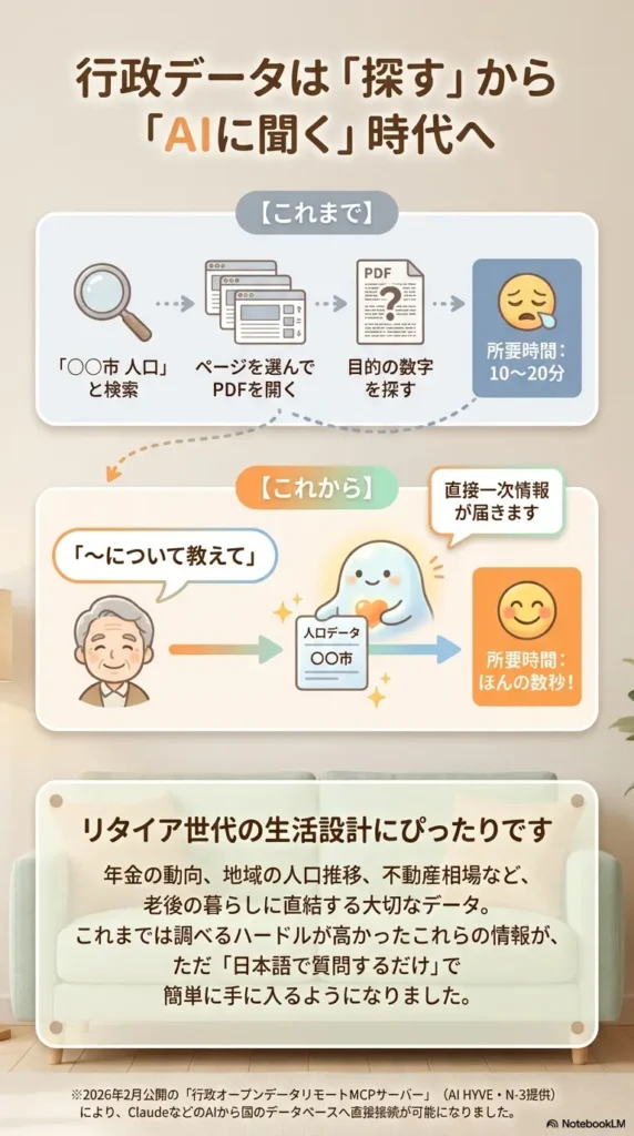 これまではそれを調べるハードルが高かったように思います。検索の手間、PDFの読み解き、どのページが最新かの判断が必要でした。それが「日本語で聞く」だけで済むようになったのは、シニア世代にとっても、とりわけ大きな変化だと思います。