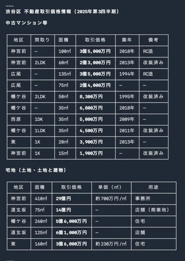 画像①:渋谷区 不動産取引価格情報  出典:国土交通省「不動産情報ライブラリ」2025年第3四半期