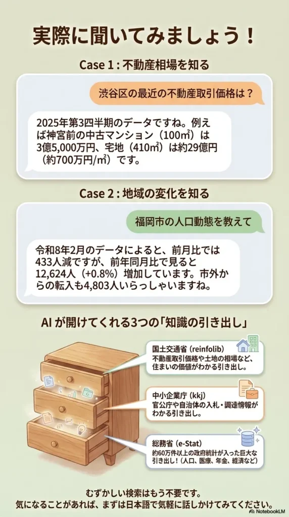 現在、対応しているデータは3種類あります。国土交通省の不動産取引価格、中小企業庁の官公需入札情報、そして総務省の政府統計(e-Stat)です。頻度は低いが、どれも「調べたいけれど、どこを探せばいいかわからない」と感じることの多いジャンルばかりです。