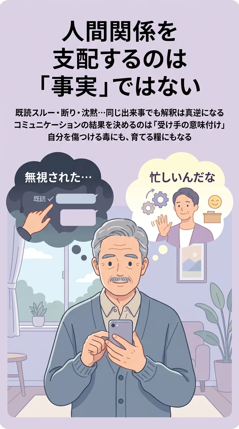 同じ言葉を投げかけられても、それを「自分を育てる糧」にする人と「自分を傷つける毒」にする人がいます。この違いを生むのは、受け手が持つ**「意味付けの過程」**です。事実という無機質な素材を、どのような「判断材料」として処理するか。その本質を理解することで、人間関係の悩みは「耐えるべき苦痛」から「対処可能な課題」へと変わります。