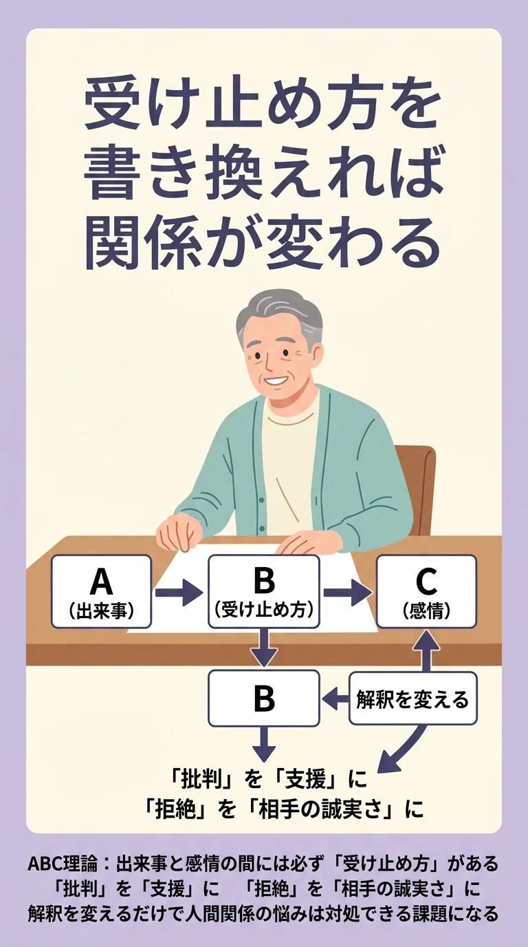心理学者アルバート・エリスは、出来事(A)が直接感情(C)を生むのではなく、必ず間に**受け止め方(B:Belief)**が介在すると説きました。