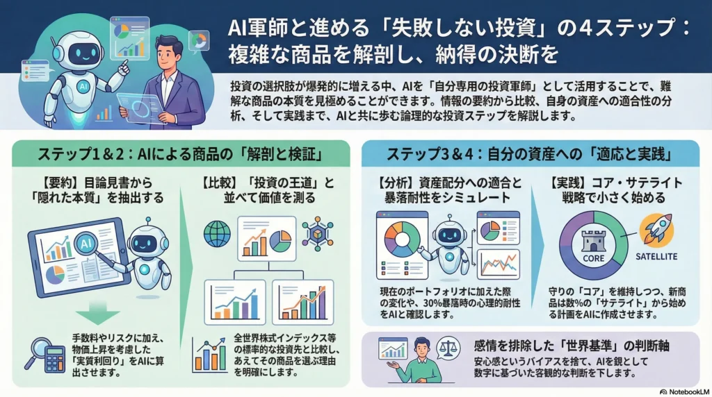 しかし、AIを「自分専用の投資軍師」として活用すれば、どんなに難解な商品でも本質を見極め、納得感のある決断を下すことができます。今回は、わからない投資商品への**「AIを使った最強の対処法」**を4つのステップで解説します。