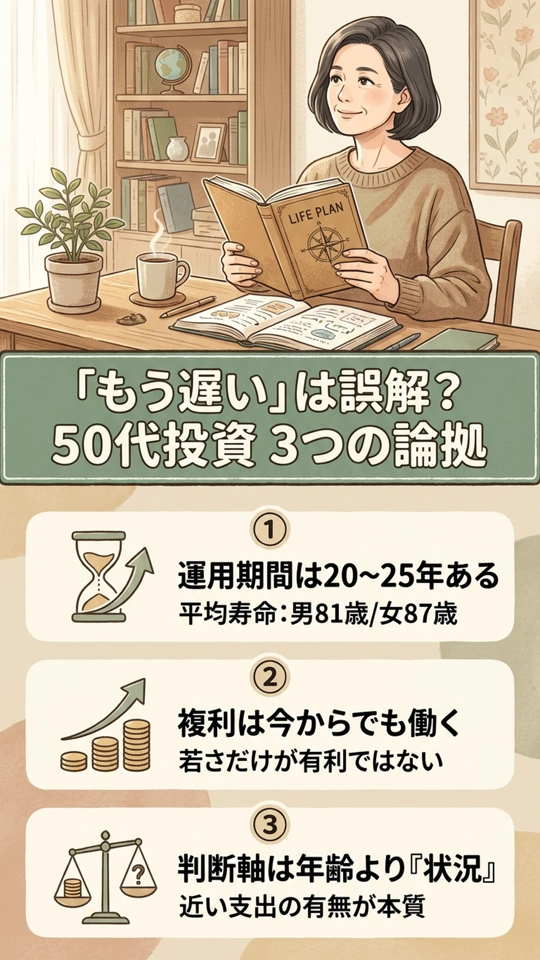 50代から投資を始めることは、平均寿命や運用期間を考えれば決して遅くありません。大切なのは「ライフプランを把握する」「近い将来の大きな支出を別に確保する」この2点を確認してから動くことです。