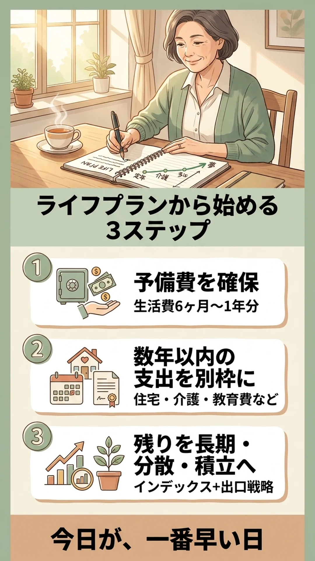 ライフプランが明確になると「何年後にいくら必要か」が見え、逆算して「今いくら投資に回せるか」が自然に決まります。これが「感情で決めない」投資の出発点です。