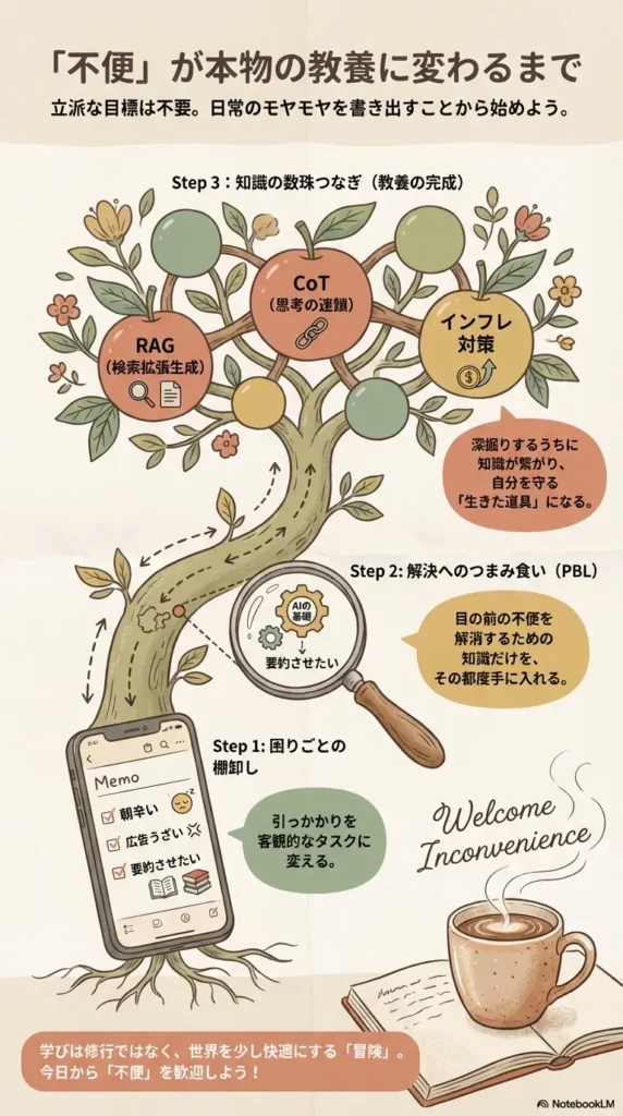 このように、一つの困りごとを深掘りしていく過程で得た知識は、断片的な暗記ではなく、太い一本の線としてあなたの血肉になります。これこそが、大人が身につけるべき本物の「教養」です。
