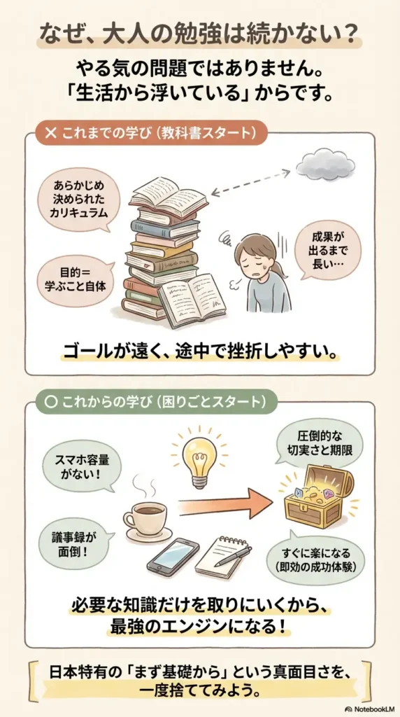 欧米では「PBL(Problem-Based Learning:問題解決型学習)」という手法が注目されていますが、これはまさに「目の前の問題を解くために必要な知識を、その都度取りに行く」という考え方です。日本の「まず基礎から」という真面目すぎるスタイルを一度捨てることが、学び直しの第一歩になります。
