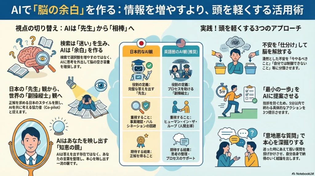 AIに正解を求めてはいけません。**自分の考えを外に放り出し、脳の空き容量を作るための「外部メモリ」**として使うのです。