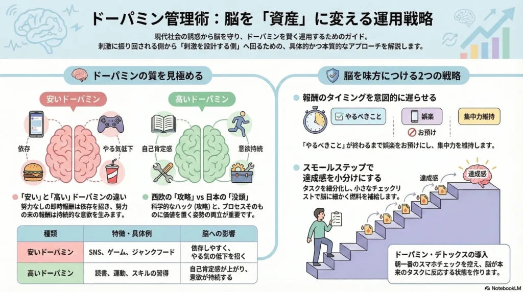 【本質】 ドーパミン運用の本質は、「刺激に振り回される側」から「刺激を設計する側」へ回ることにあります。一時的な快楽ではなく、長期的な成長に紐付いた報酬系を構築することが、知的な大人の振る舞いです。