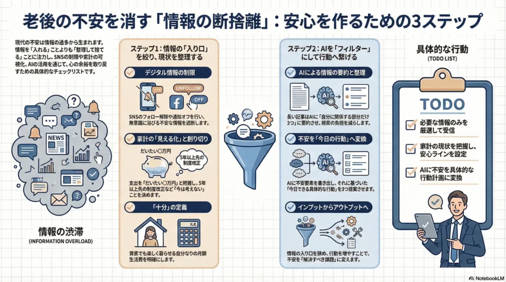 - [ ] ブックマークの厳選: 老後に関して信頼できるサイト(例:公的機関のサイト)を3つだけ選び、それ以外は見ない。