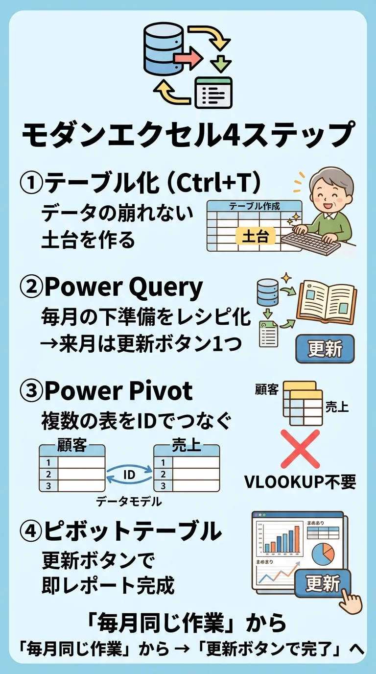 全体の作業の流れを理解しておきましょう(モダンエクセル)