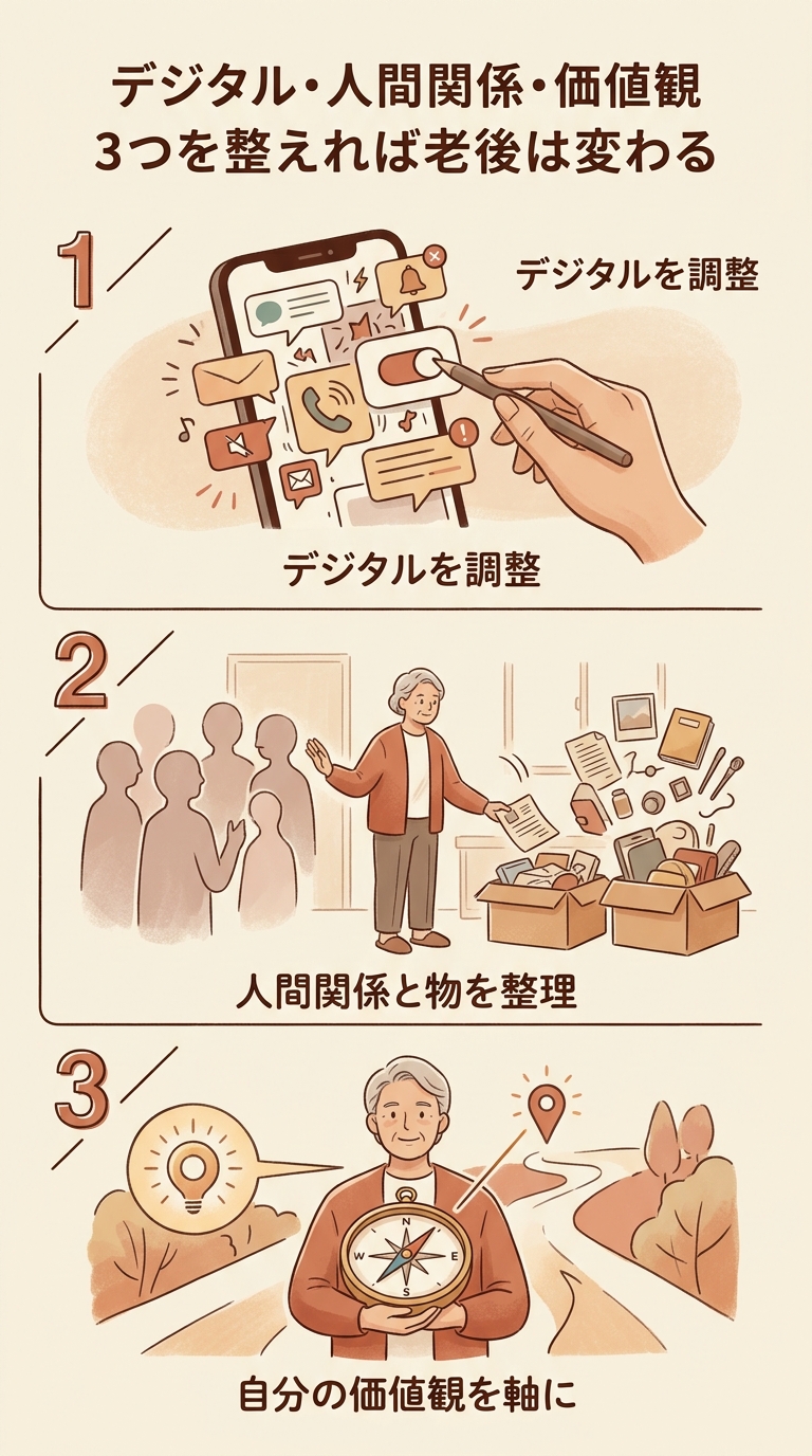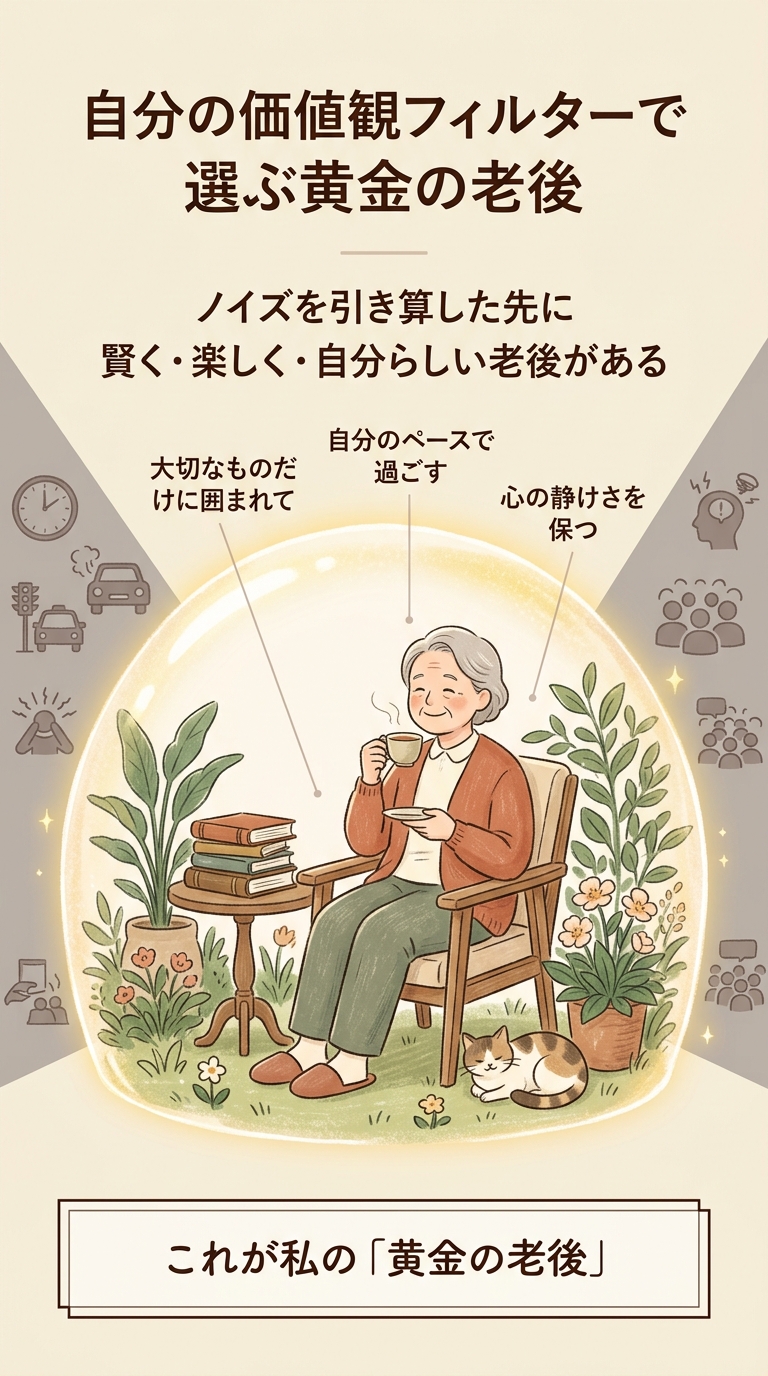 「快適な老後」とは、こうした世間のノイズに流されることなく、「自分の価値観」という唯一無二の物差しで世界を選別し、自分にとって本当に心地よいものだけに囲まれた状態のこと。それは、守りに入るのではなく、人生を再構築する最も能動的な挑戦なのです。