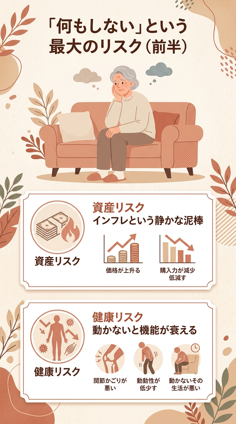**「不作為のリスク(やらないことによるリスク)」**という視点から、私たちの生活に潜む具体的な危機を考えてみます。