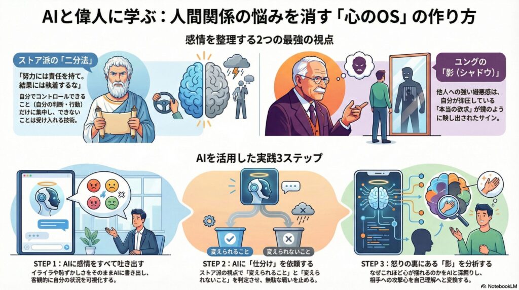 「相手は変えられない」と理屈で守り(ストア派)、「なぜ心が揺れるのか」と内面に問いかける(ユング)。