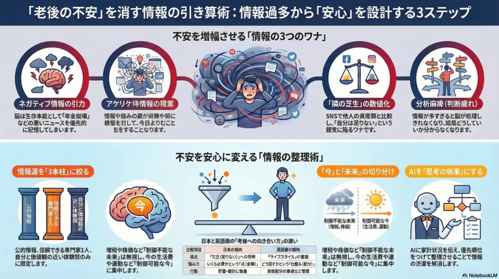実は、現代の私たちが抱える老後の不安の正体は、お金や健康の不足ではなく、皮肉にも**「情報の集めすぎ」**にあるのかもしれません。
