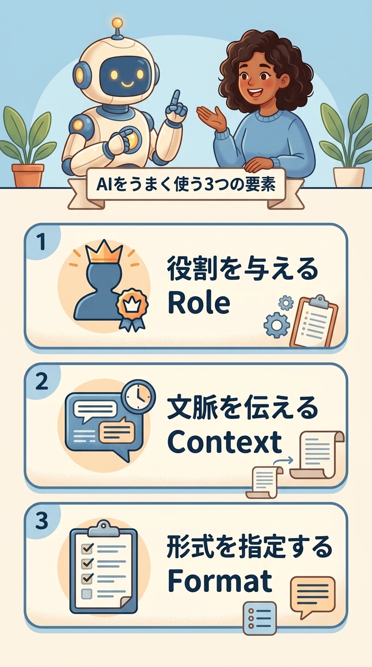 研究や実践から導き出された「効果的なプロンプト」には、共通する要素があります。プロンプト思考を実践するうえで、この3点は必ず押さえておきましょう。